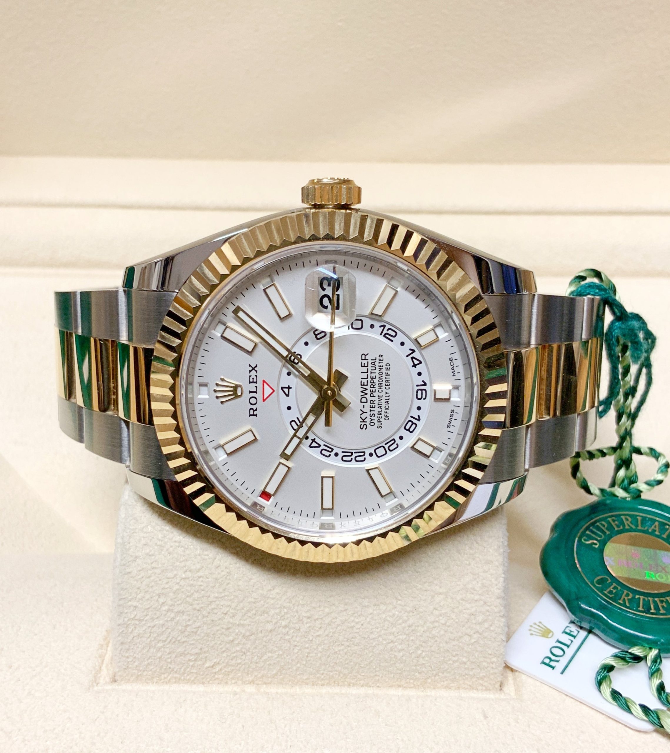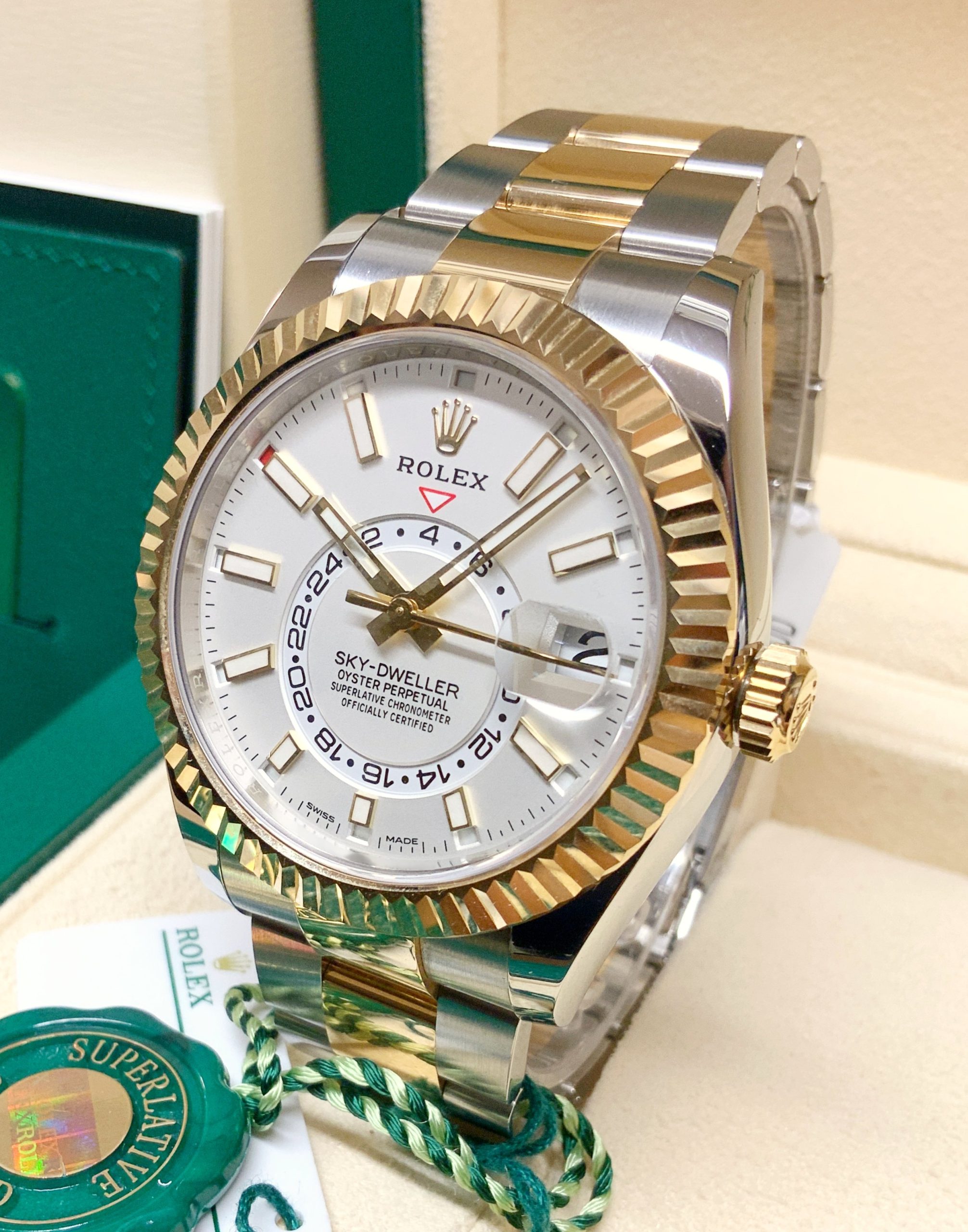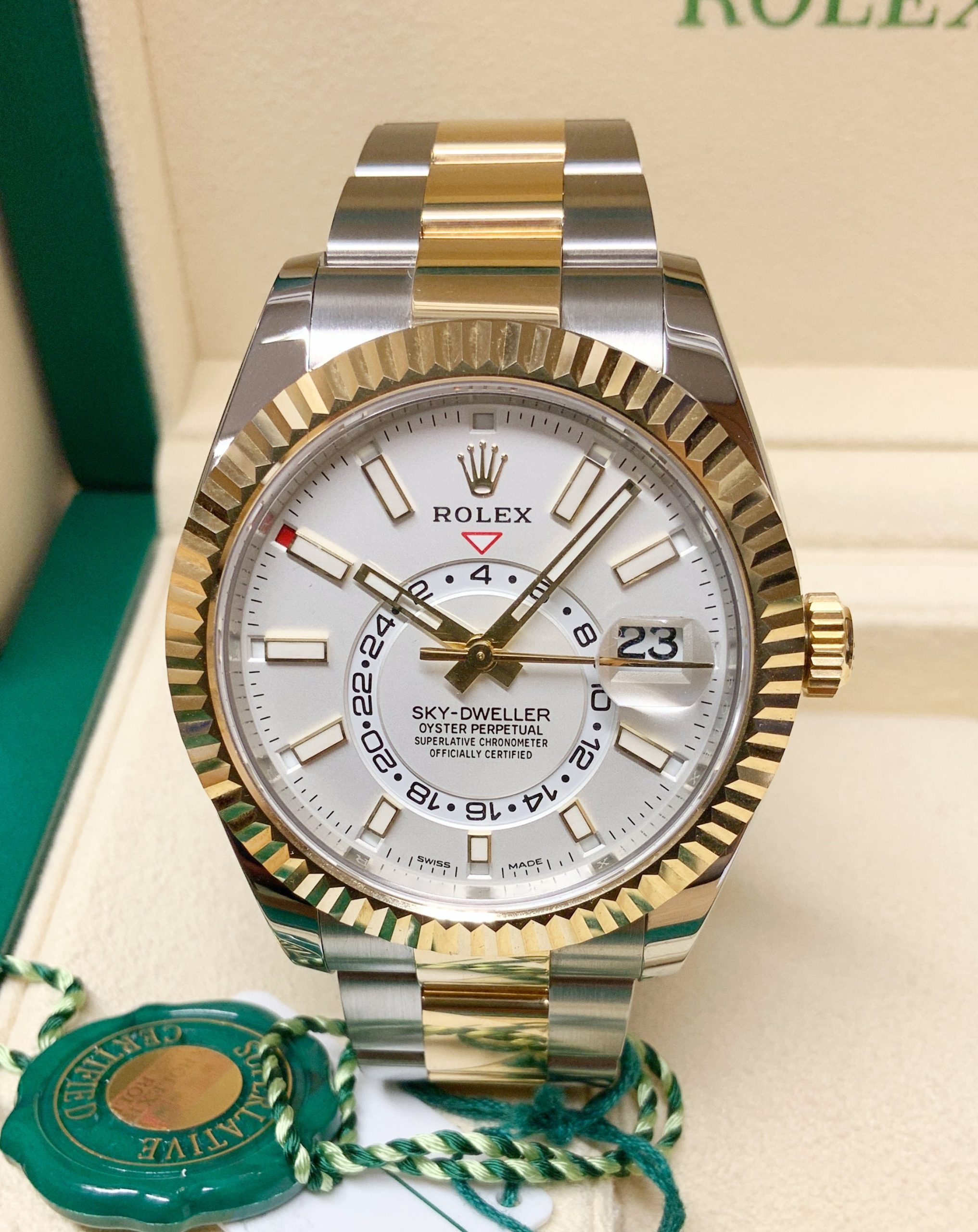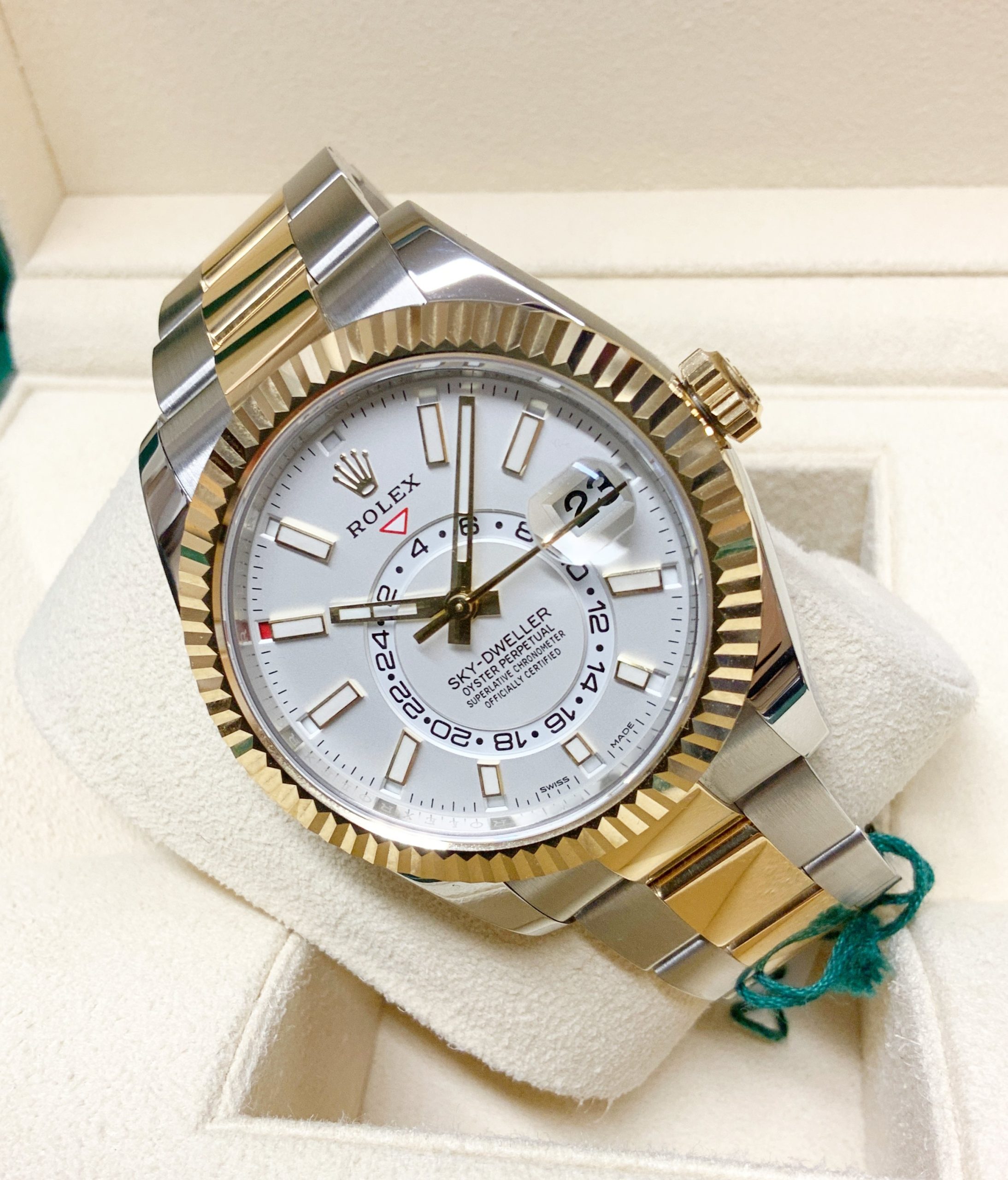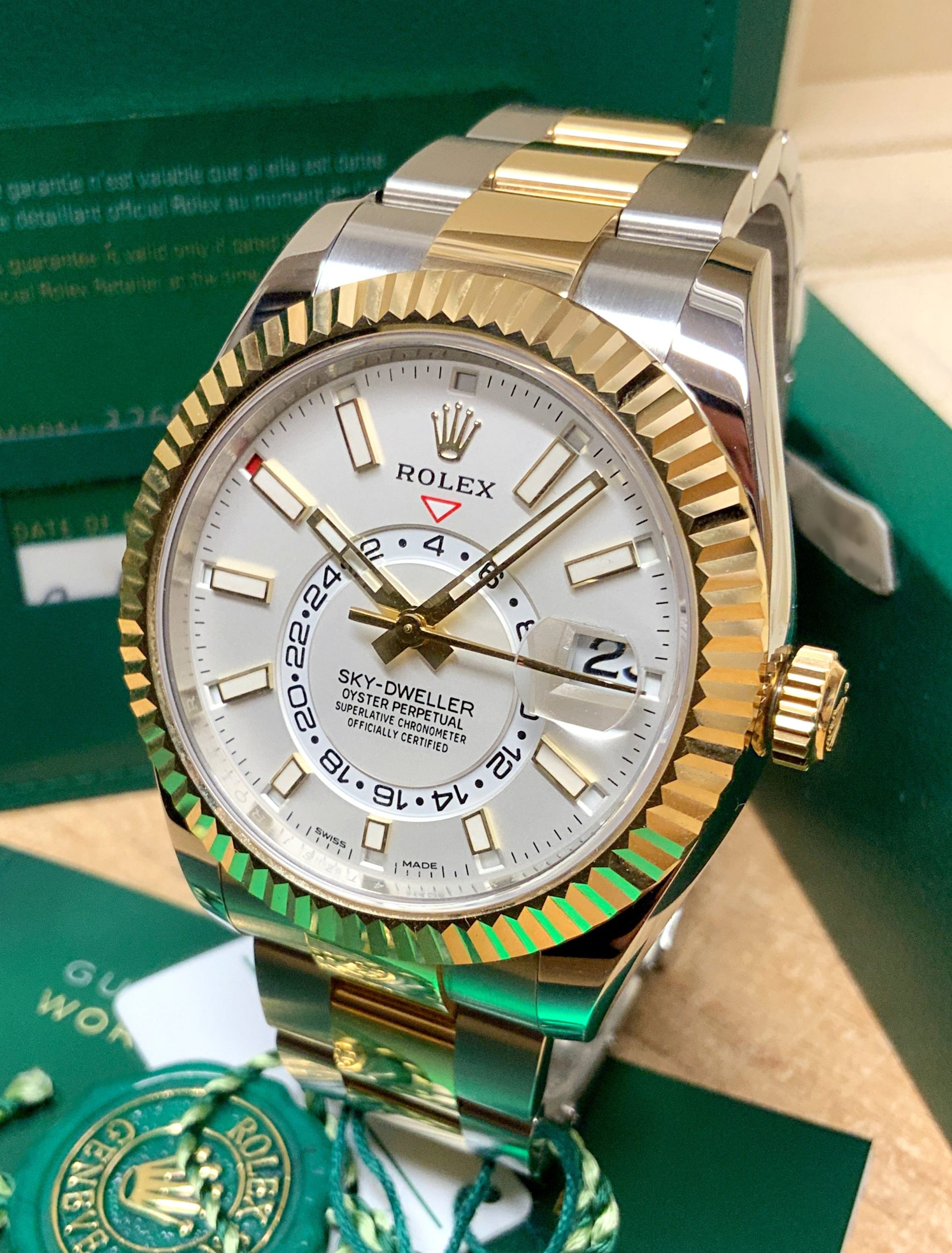 Inconfondibile capolavoro tecnologico protetto da 14 brevetti, l’Oyster Perpetual Sky-Dweller fornisce le informazioni di cui i grandi viaggiatori hanno bisogno per orientarsi nel tempo con un solo colpo d’occhio. Lanciato nel 2012, lo Sky‑Dweller si impone per la sua concezione rivoluzionaria, una perfetta alchimia tra meccanica sofisticata e comfort di utilizzo.